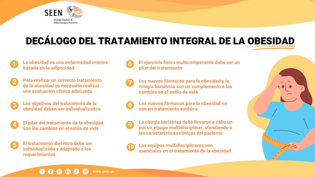 Madrid, 4 de marzo de 2025.- La Sociedad Española de Endocrinología y Nutrición (SEEN), en el marco del Día de la Obesidad, que se celebra cada 4 de marzo, ha elaborado un decálogo en el que se pone de manifiesto los principales aspectos a tener en cuenta en el abordaje de la obesidad ante su elevado índice de prevalencia, que se estima en un 18,7% de obesidad y 55,8% de sobrepeso en personas adultas en España.